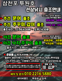 안녕하세요^^ 더블케이3호 강선장 입니다어제 야간에는 1호가 낙지 출조 다녀왔습니다오늘 야간 낙지 출조 확정입니다!! 아직 자리여유 있습니다~출조하실 조사님들 예약주세요(인원 및 상황에 따라 더블케이1,2,3호 유동적으로 출조)010 - 2216 - 5880매일 주.야간 돌문어 출조(선비 6만)(주간 오전 6시 30분 ~ 오후 2시 30분)(야간 오후 6시 ~ 새벽 1시)예약 홈페이지 주소: https://twowon.sunsang24.com/밴드 주소: https://band.us/@twowon-- 더블케이3호(투원호) 출조 안내 -- ( 4인 이상시 출조 합니다)16일 화요일 야간 낙지&쭈 - 자리여유(출조확정) 17일 수요일 주간 돌문어 - 자리여유17일 수요일 주간 쭈꾸미 - 자리여유17일 수요일 야간 낙지&쭈 - 자리여유 18일 목요일 주간 돌문어 - 자리여유18일 목요일 주간 쭈꾸미 - 자리여유18일 목요일 야간 낙지&쭈 - 자리여유 19일 금요일 주간 돌문어 - 자리여유19일 금요일 주간 쭈꾸미 - 자리여유19일 금요일 야간 낙지&쭈 - 자리여유 20일 토요일 주간 돌문어 - 자리여유20일 토요일 주간 쭈꾸미 - 자리여유20일 토요일 야간 낙지&쭈 - 자리여유 21일 일요일 주간 돌문어 - 자리여유21일 일요일 주간 쭈꾸미 - 자리여유21일 일요일 야간 낙지&쭈 - 자리여유 그 외 쭉 자리여유!!!#출조모집 #삼천포 #문어 #돌문어 #낙지 #쭈꾸미 #더블케이 #선상낚시 #생활낚시 *** 삼천포 투원호 예약 안내 ***예약문의 : 010-2216-5880오시는길 : 경남 사천시 팔포3길 56-35홈페이지 : https://twowon.sunsang24.com/